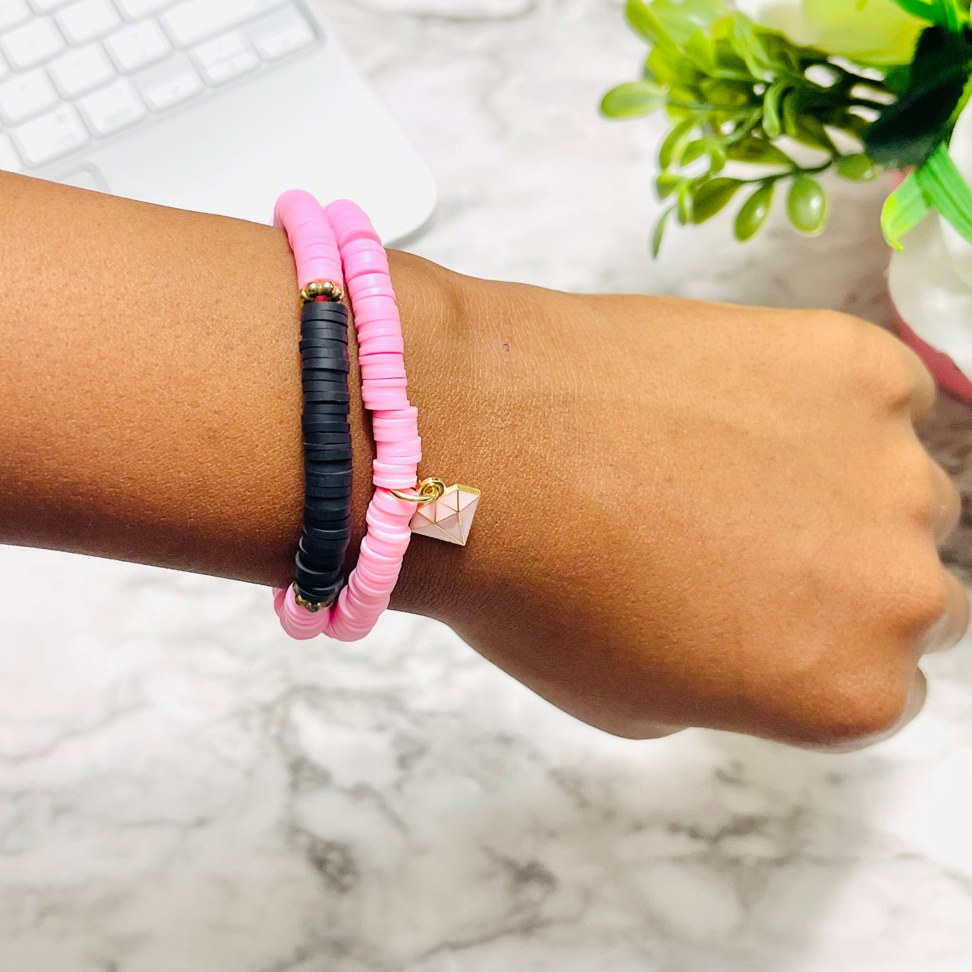 Each bracelet is handmade using soft, lightweight polymer clay beads in our pink and black color palette, finished with a luxe gold-accented diamond charm... the symbol of boldness, precision, and hustle. Whether you’re planning your next big move or stacking your savings challenge, this bracelet is your daily reminder to hustle smart and shine hard.