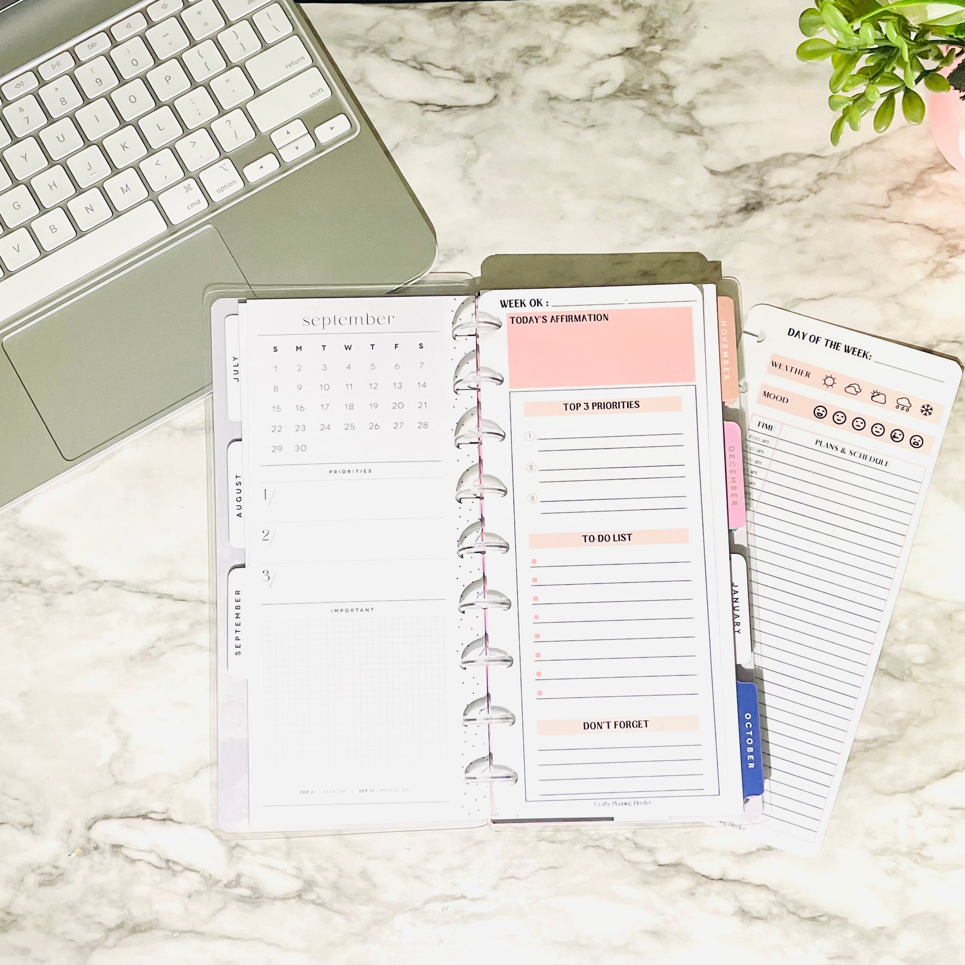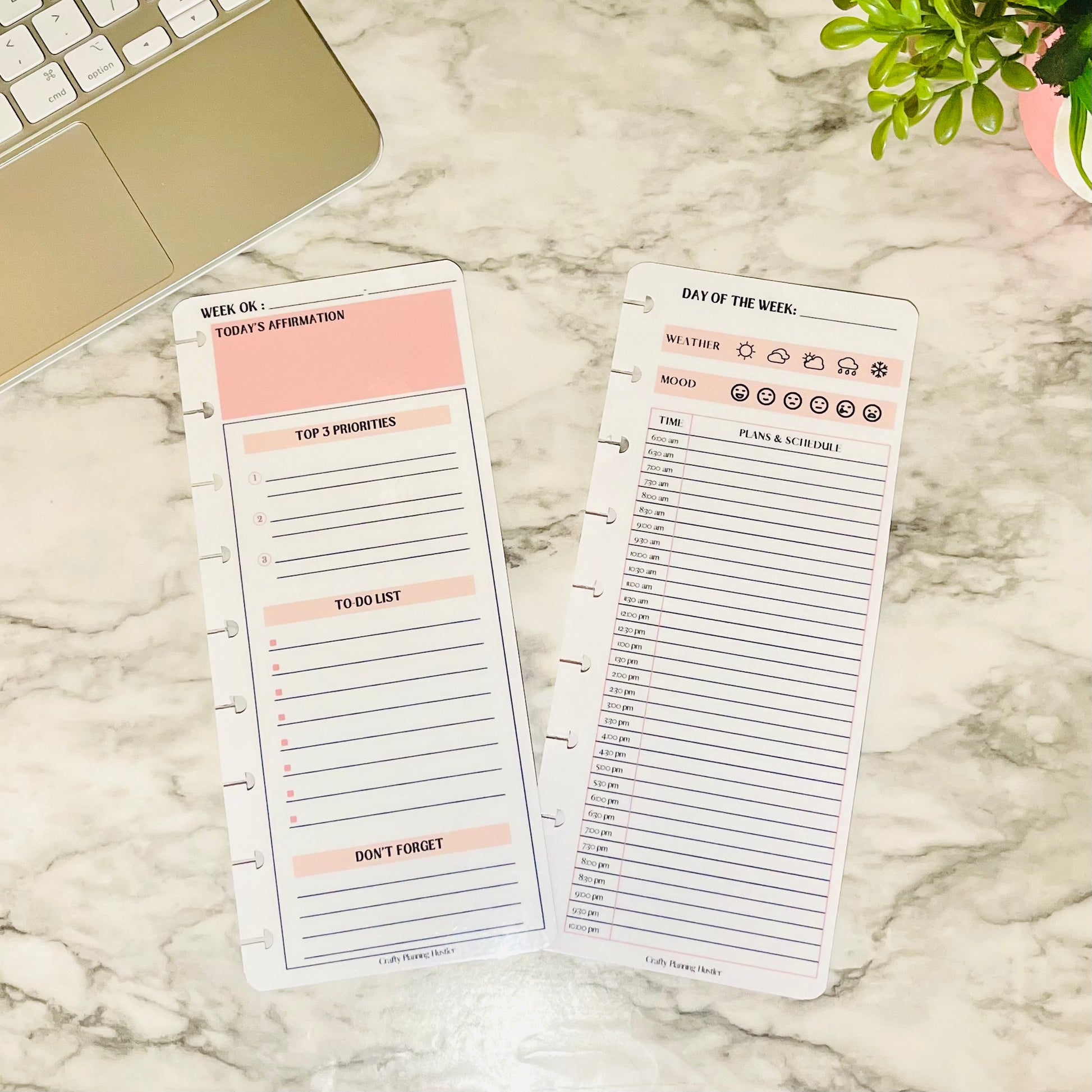 Stay organized and focused with these laminated daily and weekly agenda dashboards designed to fit your Classic Happy Planner or Skinny Happy Planner. Each dashboard helps you manage your schedule with space for weather, mood, priorities, affirmations, and a full daily time breakdown β keeping your goals clear and your plans structured.